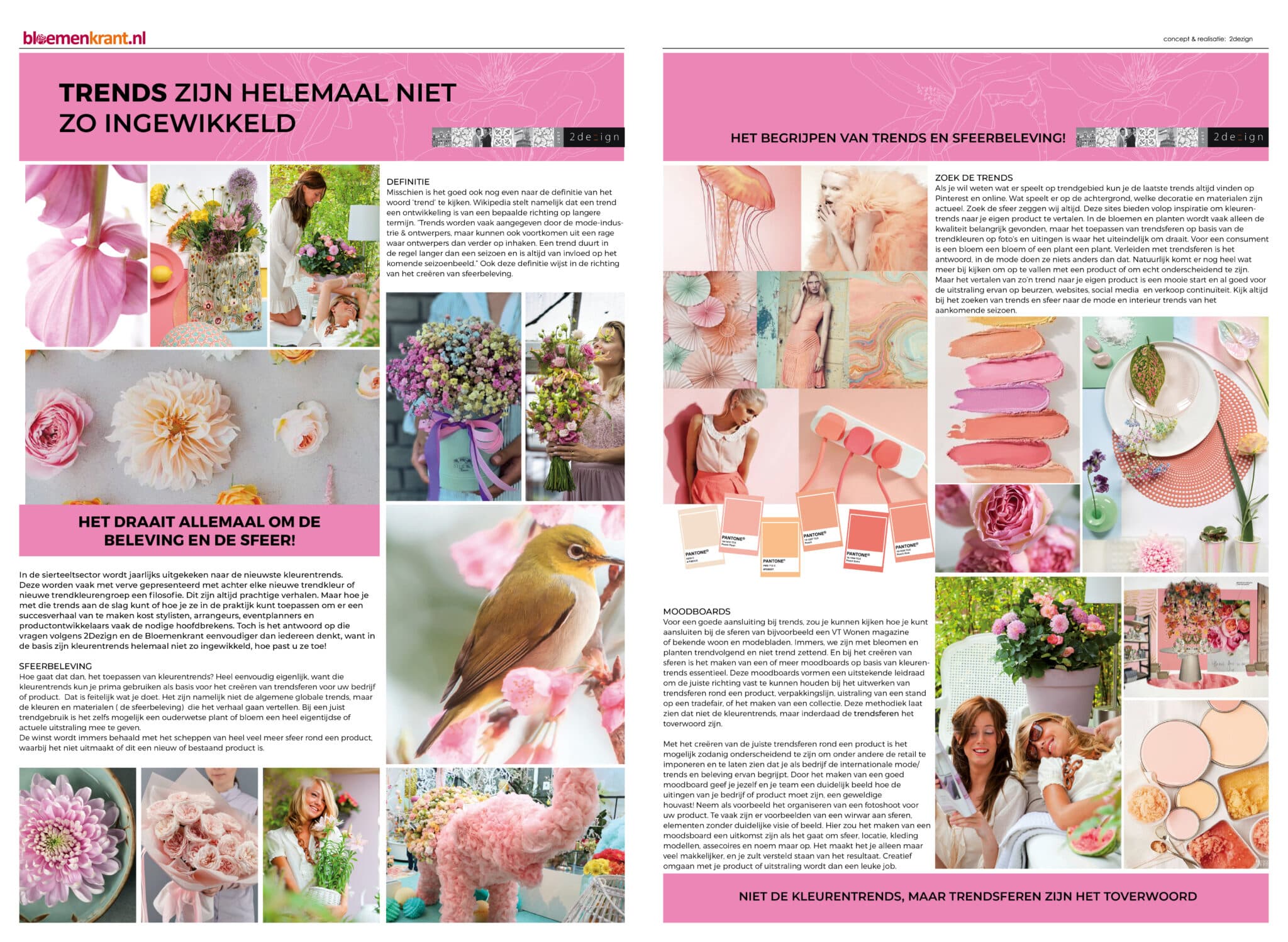 In de sierteeltsector wordt jaarlijks uitgekeken naar de nieuwste kleurentrends. Deze worden vaak met verve gepresenteerd met achter elke nieuwe trendkleur of nieuwe trendkleurengroep een filosofie. Dit zijn altijd prachtige verhalen. Maar hoe je met die kleurentrends aan de slag kunt of hoe je ze in de praktijk kunt toepassen om er een succesverhaal van te maken kost stylisten, arrangeurs, eventplanners en productontwikkelaars vaak de nodige hoofdbrekens. Toch is het antwoord op die vragen volgens 2Dezign en de Bloemenkrant eenvoudiger dan iedereen denkt, want in de basis zijn kleurentrends helemaal niet zo ingewikkeld.